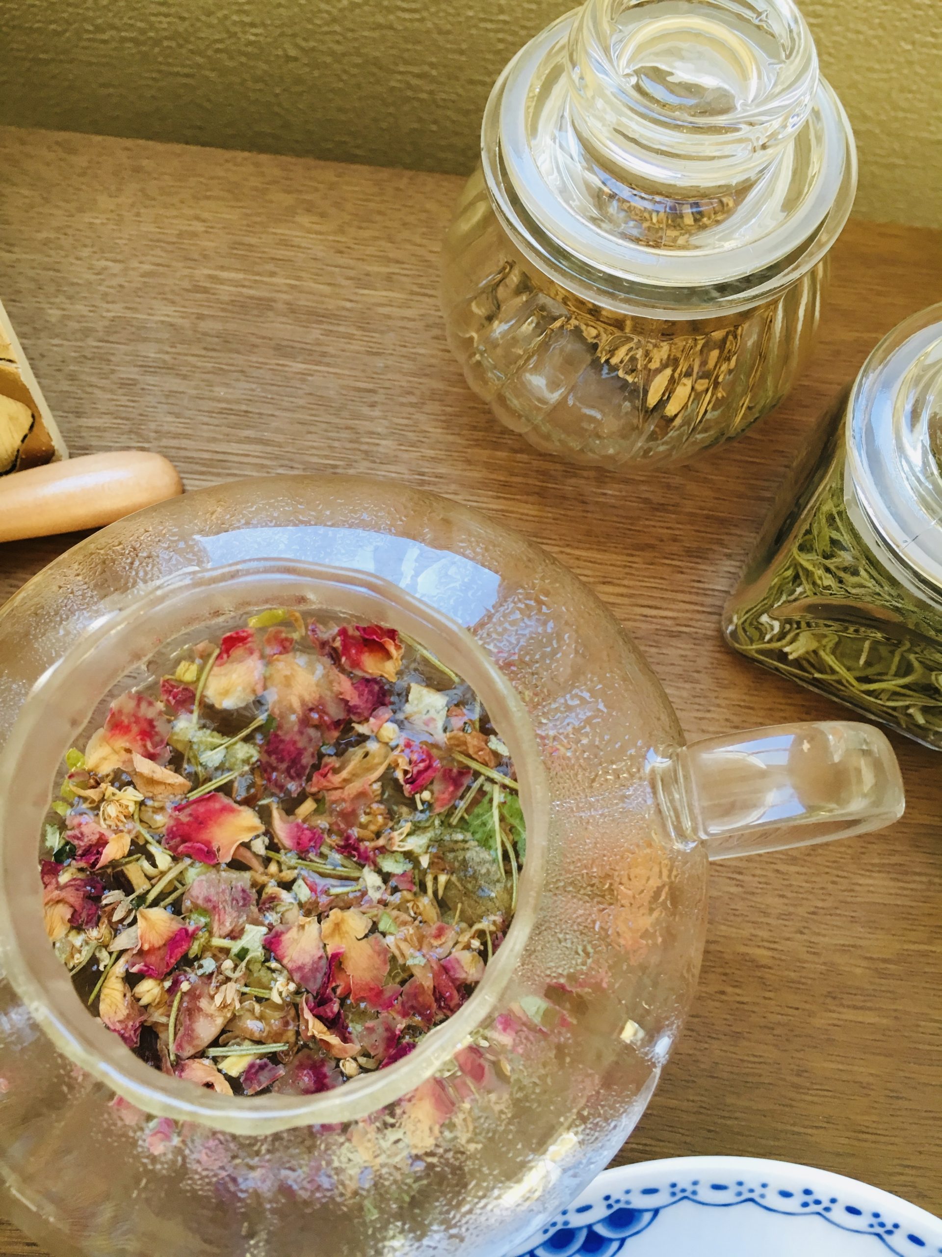 アロマトリートメントの後には、ガラスのティーポットで、お客様毎にご体調に合わせハーブをブレンドしてお出ししています。